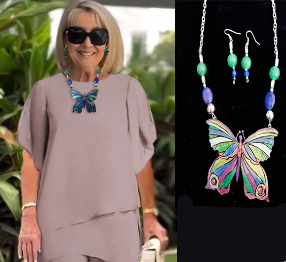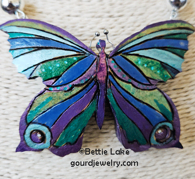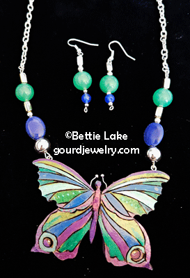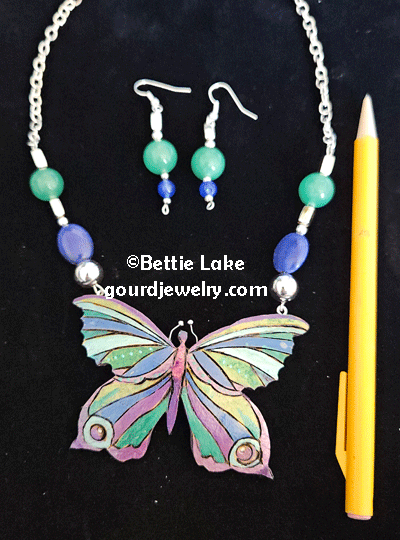 Take a look at my Blue Glow Butterfly Gourd Shard Necklace Set  This is a medium size necklace set that even a teen would love wearing. The butterfly is crafted from a thick piece of gourd, with a wood-burned pattern decorating its surface. The shard measures approximately three by two inches and is incredibly lightweight, making it a whimsical piece of jewelry. I use acrylic paints in pink, turquoise, and blue to create a vibrant mood, and your eyes will be drawn to the violet glass piece at the center of the butterfly’s body.