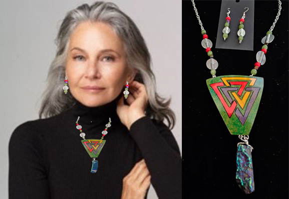 The cut gourd shard measures 2 inches by 2 inches, with the iridescent stone hanging at the bottom representing the successful project. The silver-tone chain hangs 12 inches from the neck and has unique circle beads and tiny green and red colored beads that are repeated in the matching earrings. This gourd shard necklace might be just for you, or maybe a friend would enjoy it. Buy it now, and I ship it for free!
